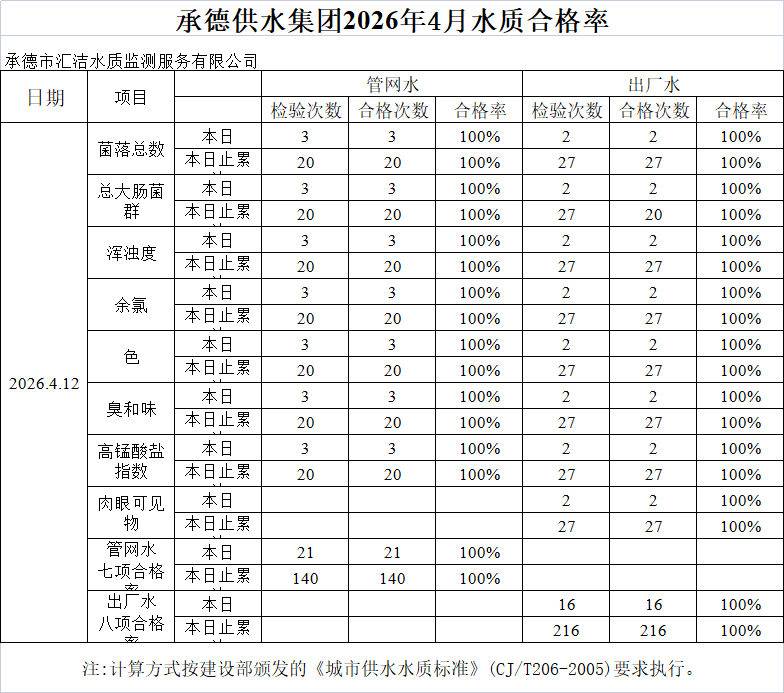 承德供水集團(tuán)2026年4月12日水質(zhì)合格率