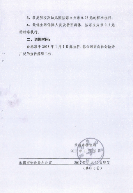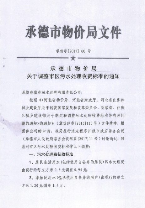《承德市物價(jià)局關(guān)于調(diào)整市區(qū)污水處理收費(fèi)標(biāo)準(zhǔn)的通知》承價(jià)字【2017】60號(hào)